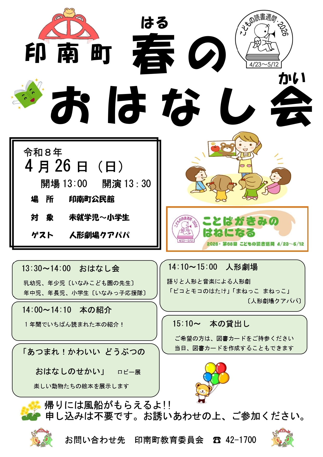 4月23日から5月12日の「こどもの読書週間」に合わせて、春のおはなし会を実施いたします。