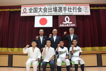 7月31日(火)に印南町公民館において全国大会出場選手壮行会が開催されました。久保井亜門くん、福田蒼太くん、中村彩人くん、村上香汰くんをはじめ、当日参加することができなかった11名の選手を含めた15名の選手が町長、教育長をはじめ多くの方から激励をうけました。最後に出場選手からの抱負宣言が行われ、力強く大会での活躍を誓いました。