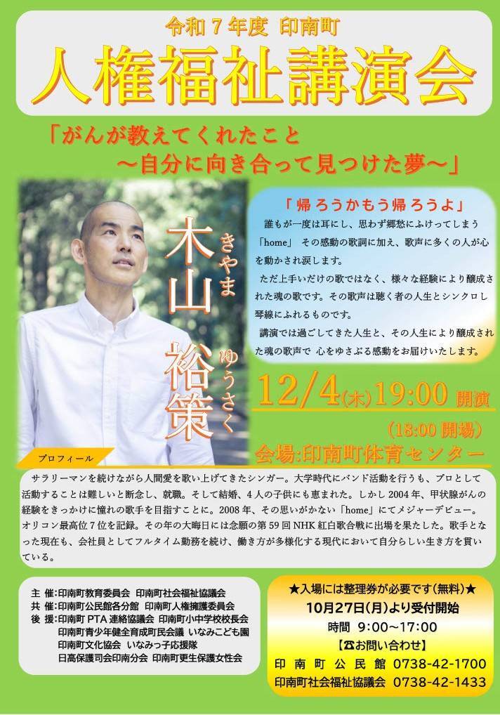 ヒットソング「home」でおなじみの木山裕策氏をお招きし、歌とお話を交えた人権福祉講演会を開催します。