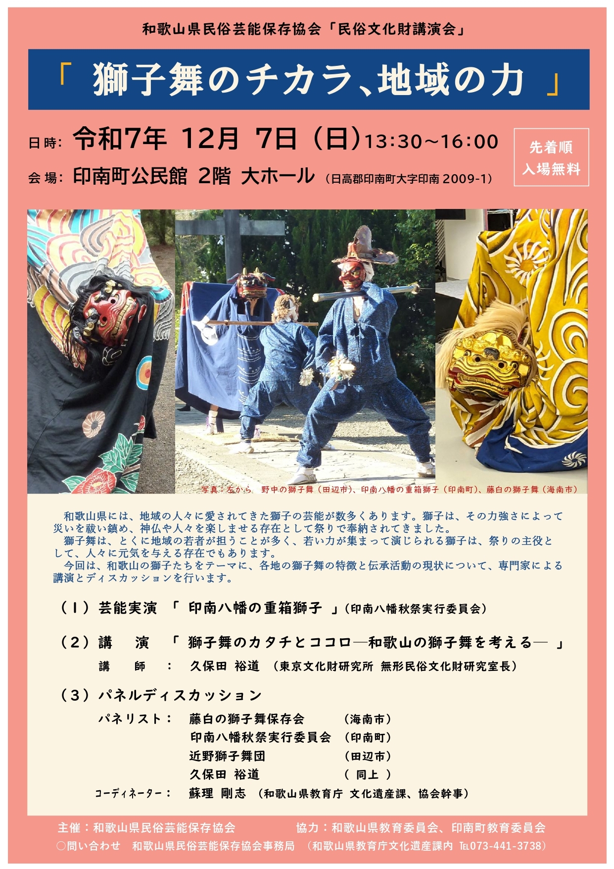 和歌山県民俗文化財講演会(和歌山県民俗芸能保存協会 主催)が今年度は印南町で開催されます。